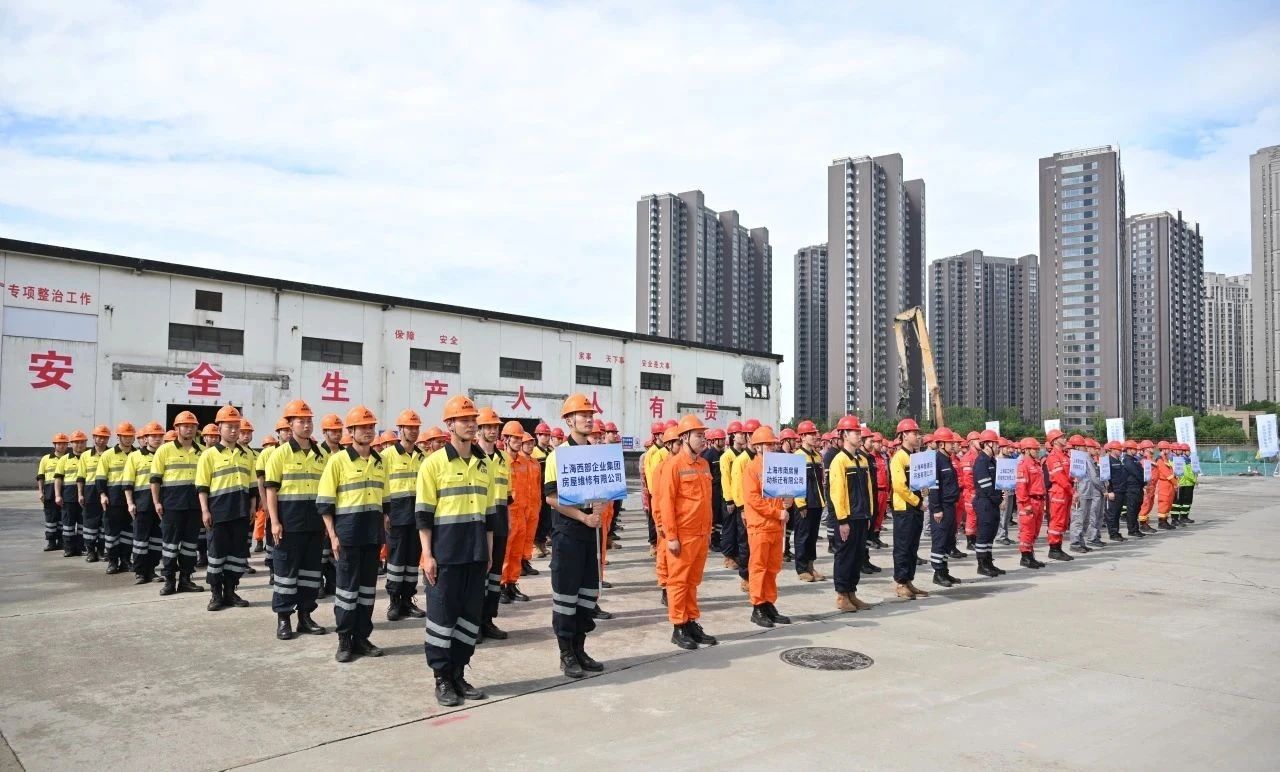 演练伊始,西部房修、上海衡元、申普建设、上海凌锐建设等9支市级应急抢险队伍列队入场,这些队伍曾参与多次获评“全国工人先锋号”“上海市重点工程立功竞赛先进集体”等称号,展现了过硬的专业素养和丰富的实战经验。在设备检阅环节,射程达30米的洒水车、可360度旋转排水的启秀60水泵、13.5米高空作业车、曲臂登高车、长臂液压剪刀机等现代化应急设备逐一亮相,集中展示了应急处置的机械化、专业化水平。