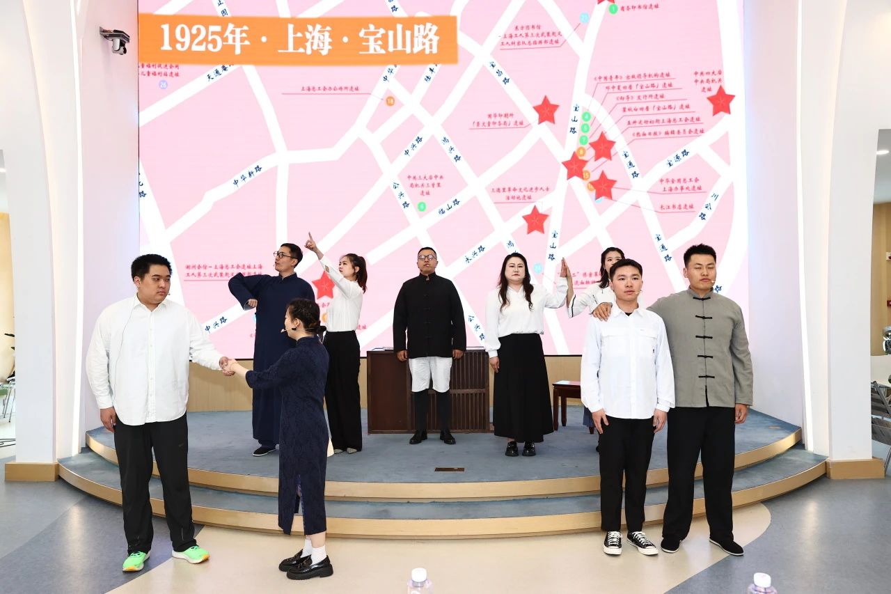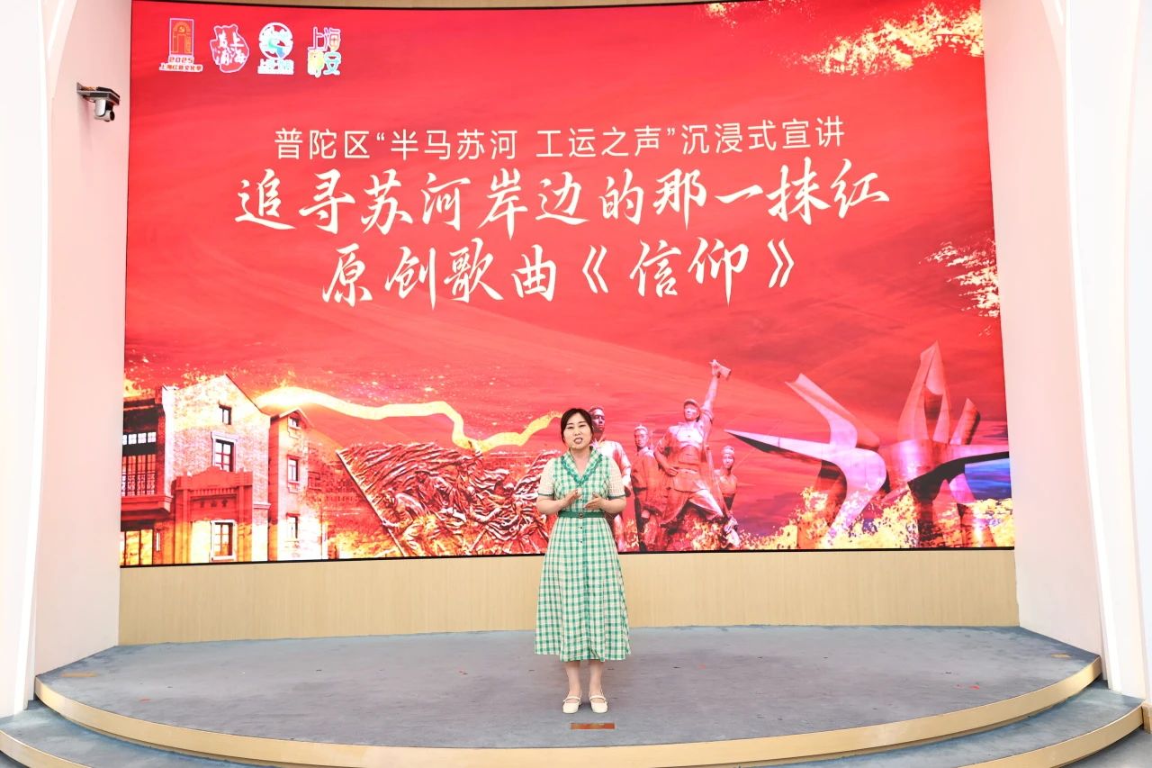 活动现场,静安区带来的情景党课《觉醒之路——穿越五卅百年》沉浸式演出,演员穿梭于观众间生动再现了那段波澜壮阔的历史;“此刻华夏儿女声如狮吼,扑向刀丛求觉醒”,黄浦区表演的评弹《五卅英魂传》以铿锵有力的乐声诉说着五卅英烈的不朽事迹;由普陀区带来的沉浸式宣讲《追寻苏河岸边的那一抹红》和原创歌曲《信仰》带领观众溯觅工运之源,聆听跨越百年的时空对话,体悟工运领袖的不朽精神。