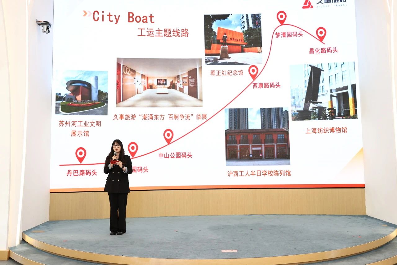 活动现场还启动了“逐梦江河百年工运”红色主题线路三区联动苏州河游船试航。上海久事旅游(集团)有限公司对红色主题线路命名为CityBoat工运主题线路,以苏州河为纽带,串联起三区“一江一河”工运遗迹,包括普陀的顾正红纪念馆、静安的四行仓库、黄浦的渔阳里等等,融合CityWalk元素编织成“觉醒—抗争—新生”的叙事链,让游客在碧波荡漾中触摸百年工运的脉搏,实现红色文化从静态陈列到动态体验的跃升。