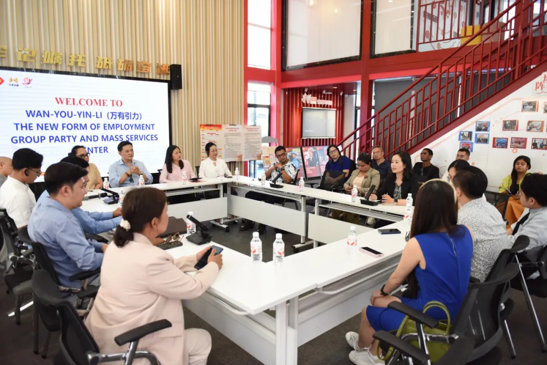 东南亚多国政党考察团参观了万有引力新业态新就业群体党群服务中心各功能空间,深入了解阵地功能定位、特色服务、新就业群体党建以及基层治理实践成效。座谈会上,双方围绕阵地建设、管理机制、服务创新及践行全过程人民民主等方面深入交流。考察团充分肯定中心的创新理念及工作成效,并结合本国实践经验提出完善新就业群体劳动权益保障立法、拓宽服务覆盖面等建议,为新兴领域群体服务体系建设提供借鉴。