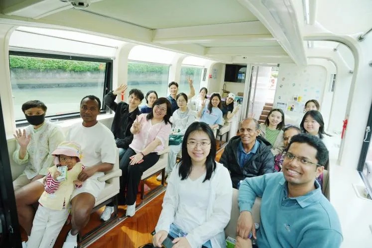 随后,外籍志愿者们集体乘坐大巴前往苏河长风码头,登上游船开启了一段60分钟的“水上之旅”。从工业遗存到现代艺术空间,苏州河两岸的历史变迁令众人赞叹不已,频频举起相机记录下这美好瞬间,河水映照着城市的繁华与历史的沉淀,仿佛在诉说着上海的昨天与今天。