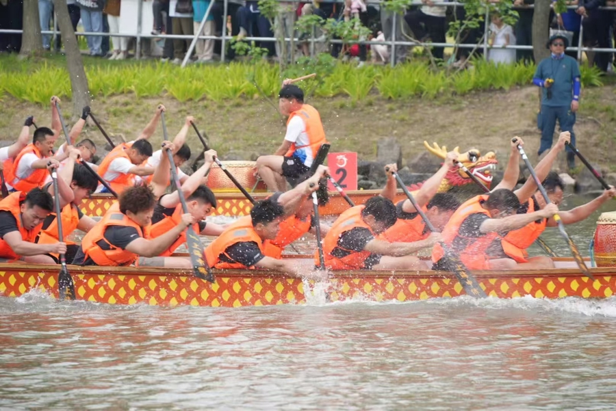 鼓手铿锵有力的击鼓声、队员整齐划一的号子声、岸边观众热情的呐喊声,交织成一曲慷慨激昂的端午乐章,共同演绎出一幅“水美、城美、人美”的生动图景。