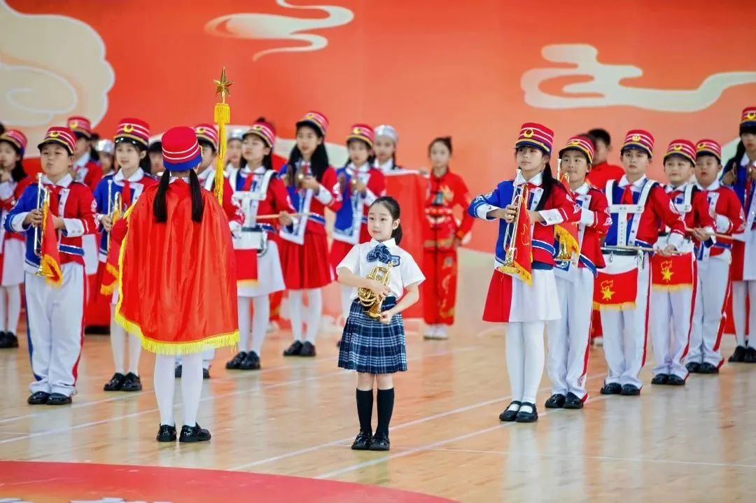 每一届鼓号大赛都是闵行少先队的璀璨名片,今年,全区共有106个少先队大队、近万名少先队员参与鼓号大赛。“持号要像举着星星火炬,手腕不能抖!”为了参加比赛,少先队员们认真训练,小号手对着镜子练口型,腮帮子酸到咬不动筷子;鼓手盯着节拍器数上万次节奏,鼓棒在掌心磨出红印;旗手举着队旗定军姿,汗水顺着下巴慢慢滴下……日复一日的训练,最终汇聚成了一场场完美的演出。