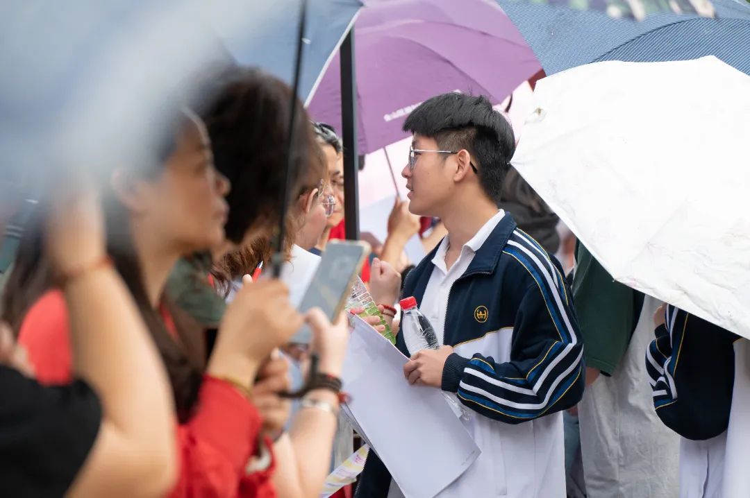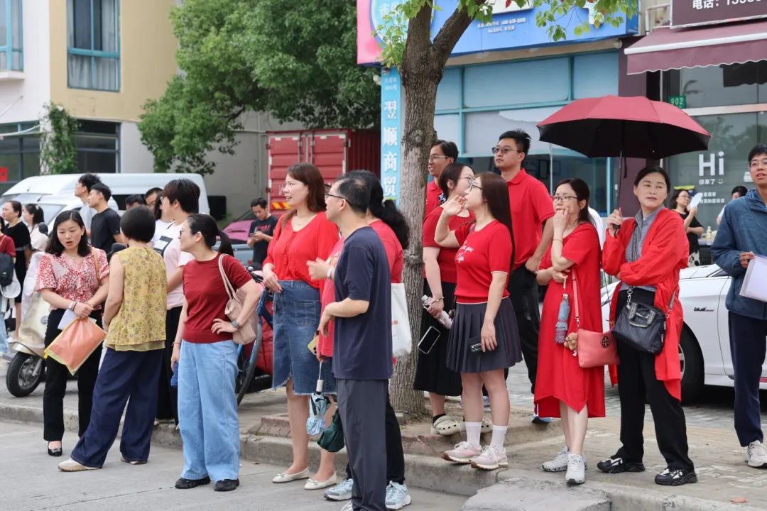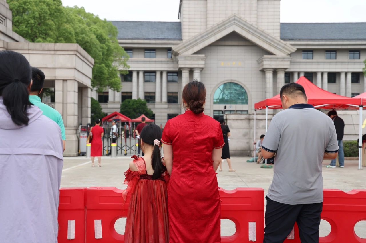 在莘莘学子奔赴人生大考之际,亲属团们的身影也形成了一道亮丽的风景线。妈妈们身着寓意“旗开得胜”的旗袍,爸爸们穿着红色短袖,希望孩子“鸿运当头”。