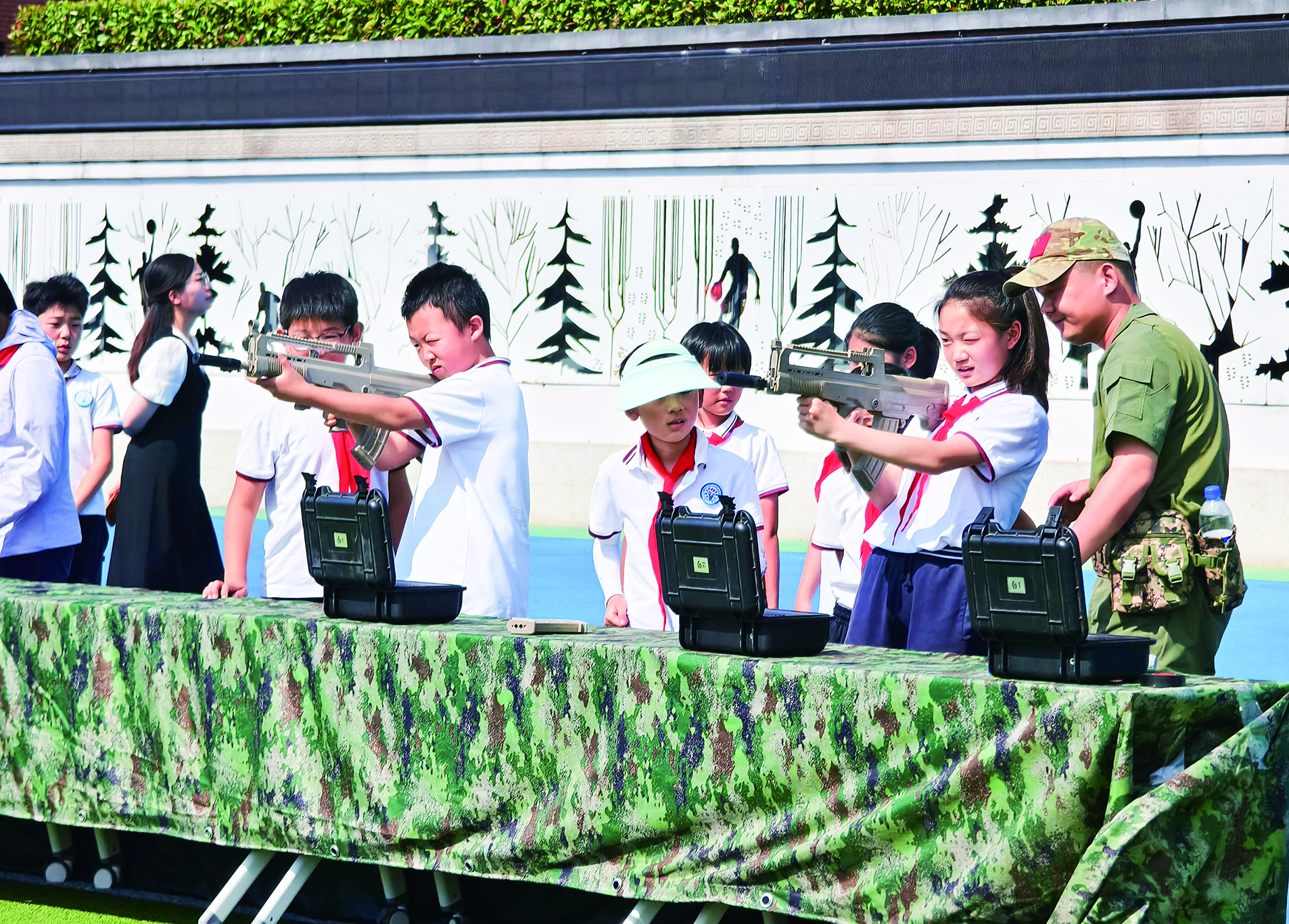 红色血脉永流传,少年当立强国志。在现场,除了“翔翼无人机”社团带来的无人机队列表演,佘山外国语实验学校的孩子们还表演了情景剧《满江红》,将岳飞精忠报国的赤胆忠心与抗日战争时期中国人民奋勇抗争的革命岁月交织呈现,展现了他们对于红色文化和国防事业的火热激情和深刻理解。而在外场的全民国防教育集市和全民国防实训体验区,众多佘外少年流连在军事装备展示、国防科技体验及文明实践项目摊位前探究、体验。不少孩子还踊跃参与到实训中来,亲手打靶、发射炮弹和水火箭,沉浸式感受国防军事的别样魅力。