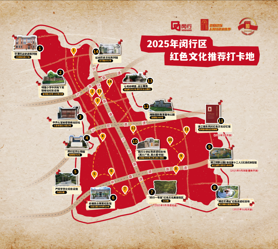 自红色文化季系列活动启动以来,闵行区推出了14处红色文化推荐打卡地。此次展览将这些点位做成了打卡地图,市民在参观展览后,可以通过现场互动活动领取地图和藏有打卡地胶片的“红色票根”,并根据地图提示信息前往红色阵地参观打卡。