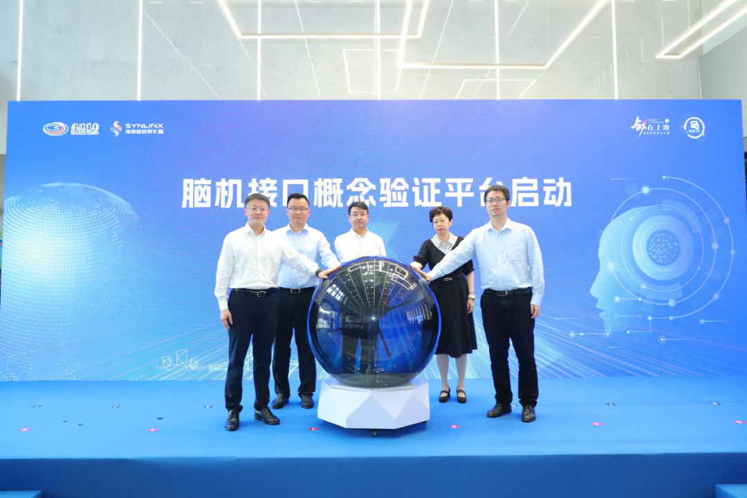 活动现场,郁红漪、上海市科委前沿交叉处副处长王卓曜、临港科投总经理刘甡轶,携手上海未来产业基金、上海农商银行代表,为“脑机接口概念验证平台”揭牌。