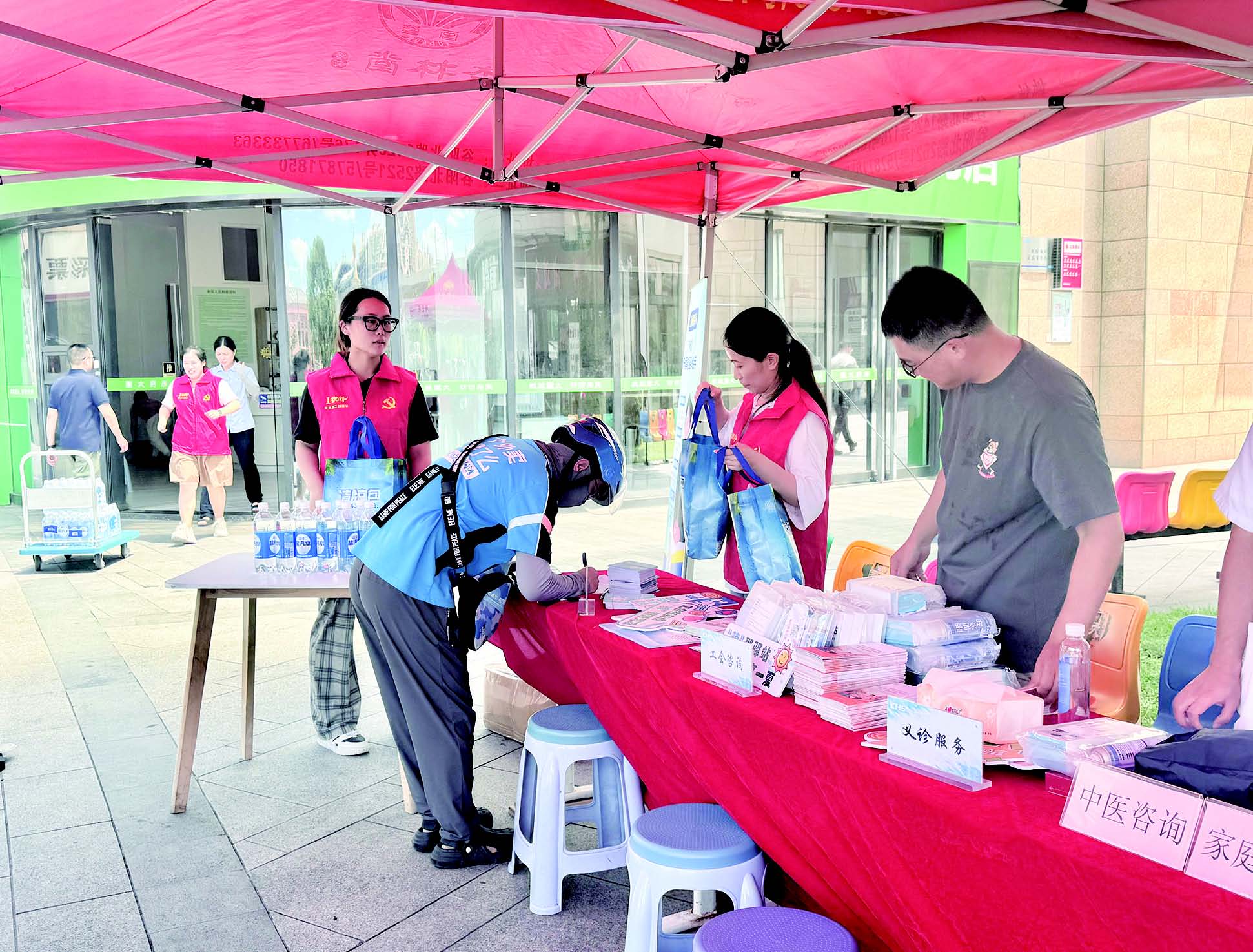 高温下,前来领取清凉礼包、接受义诊的新就业群体劳动者络绎不绝。一旁的国大药房工会驿站内,也有不少户外劳动者在此落脚休息。“驿站设有空调,我经常在送餐间隙时来这里避暑歇脚。今天还收到了清凉用品,感觉特别暖心。”外卖员于建锋说道。