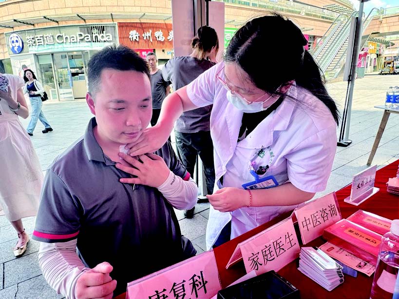 “来,喝瓶盐汽水解解暑,这边还有解暑中药饮品。”当天下午,伴随着工作人员热情的招呼声,活动于国大药房(梅家浜路店)工会驿站火热开展。现场,盐汽水、降温冰贴、降温喷雾及毛巾、洗发水、沐浴露等防暑降温物品整齐摆放。来自区总工会、区医保局、广富林街道社区卫生服务中心、国大药房梅家浜路店的工作人员同时开设服务摊位,提供中医义诊、三伏贴贴敷、政策咨询等便民服务。