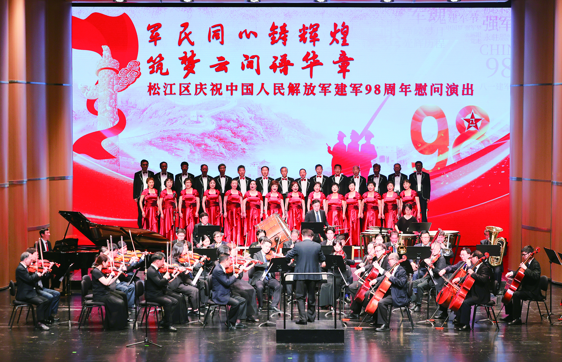 昨日,“松江区庆祝中国人民解放军建军98周年”慰问演出在云间会堂文化艺术中心举办,一首首经典歌曲现场唱响,引发全体观众大合唱。