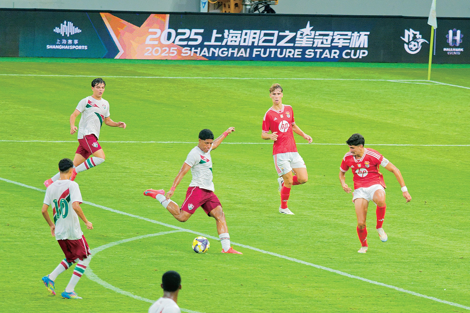 今年赛事聚焦U16年龄段,东道主上海队与曼城(英超)、切尔西(英超)、马赛(法甲)、本菲卡(葡超)、莱比锡红牛(德甲)、弗鲁米嫩塞(巴甲)、神户胜利船(J联赛)7支U16梯队展开对决。作为上海自主品牌赛事,明日之星冠军杯已连续举办四届,成为展现城市活力与海派文化的重要窗口。为扩展赛事外延,本届赛事以“足球+”模式激活城市消费场景,通过“票根经济”实现文旅商体展联动,联动全市商圈、社区开展丰富多元的活动,打造一场多维度的城市嘉年华。图为比赛现场精彩瞬间。