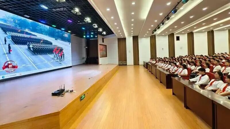 宝山实验学校全体师生满怀激动与期待,准时收看纪念中国人民抗日战争暨世界反法西斯战争胜利80周年阅兵式直播。学生身着校服,坐姿挺拔,脸上洋溢着自豪与崇敬。当整齐的受阅方队迈着铿锵有力的步伐通过天安门广场时,师生们被那磅礴的气势深深震撼,礼堂内不时爆发出热烈的掌声。看到先进的武器装备展示,大家更是惊叹不已,由衷感叹国家军事力量的强大。有的同学忍不住与身边伙伴轻声交流,分享内心的震撼;有的同学则全神贯注,生怕错过任何一个精彩瞬间。