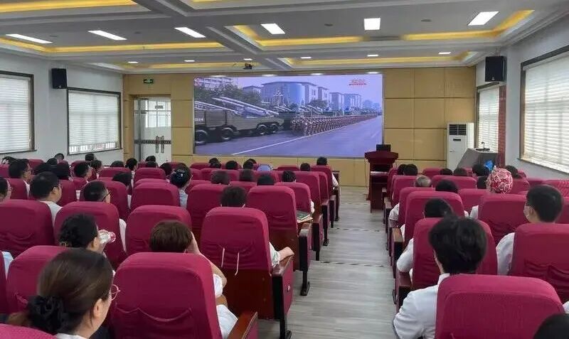 宝山区中西医结合医院的收听收看现场气氛庄重而热烈,洋溢着浓浓的爱国情怀。当激昂的《义勇军进行曲》奏响,五星红旗冉冉升起时,全体医护人员肃然起立,齐声高唱国歌。医护人员通过现场的大屏幕感受到了受阅部队官兵挺拔的军姿、坚定的眼神、整齐划一的队列、铿锵有力的步伐,以及彰显着国家科技实力与国防现代化水平的先进武器装备,全方位展示了中国军队的威武之师、文明之师、胜利之师的形象,引得现场医护人员发出由衷的赞叹。
