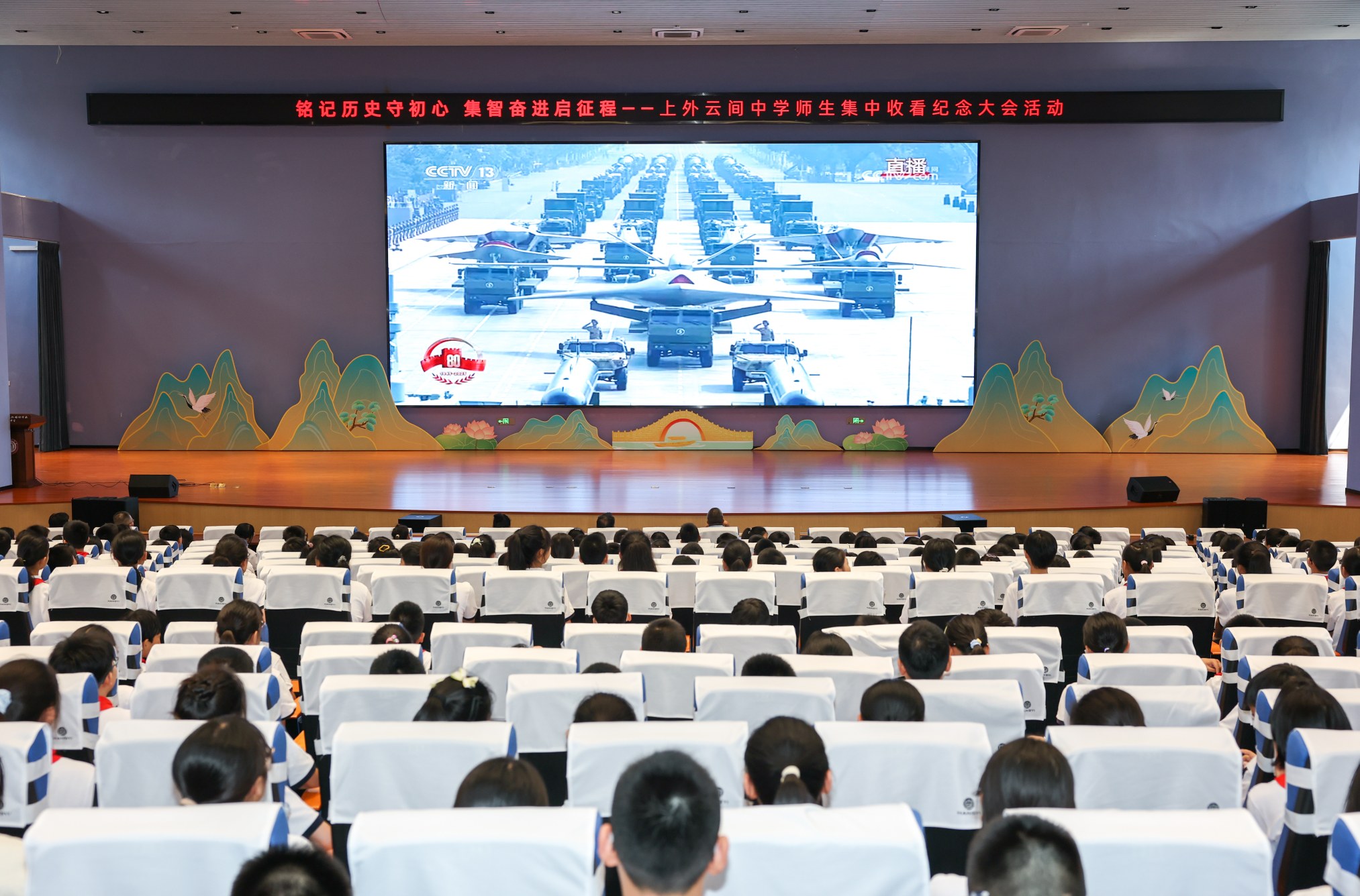 上外云间中学“云堂”会场座无虚席,后方还支起高脚板凳,师生们凝神等待。当雄壮国歌响起,全体师生肃立高唱,豪情在会场奔涌。阅兵环节,师生目光追着镜头,现场多次响起掌声。七(6)班学生肖妤煊坦言:“我的父亲也是一名军人,小时候总是盼着他早点回家,而今我对他身上肩负的责任有了更深刻的理解,我为所有保家卫国的军人感到骄傲。我以后也要做有担当、能为国家出力的人。”