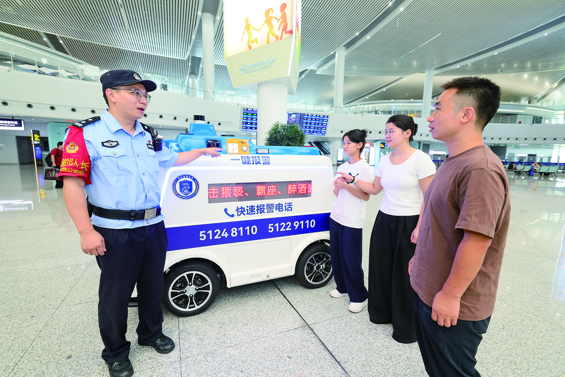 “你好,松江所指挥室,您遇到什么问题了?”近日,一辆警用无人智能车在上海松江站候车大厅“忙活”开来。原来,它正在开展巡逻工作,并通过“一键报警”功能实现旅客与后方指挥室实时视频通话功能,及时处置突发状况,为广大旅客平安出行筑起安全防线。
