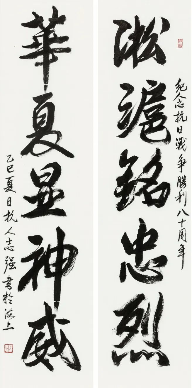 区文联主席陈志强参展的作品是行书《淞沪华夏联》,他表示,上海是中国人民抗日战争非常重要的抗日战场,特别是淞沪会战,是抗日战争第一次大规模的正面会战,中国军人以伤亡25万的代价,与日寇血战3个多月,顽强抗击了日本军队的长驱直入。“淞沪会战,彻底打碎了日本侵略军3个月灭亡中国的狂言,把日本鬼子拖进了八年抗战,今天我们纪念抗战胜利80周年,也应该把上海的抗战事迹和抗战历史写进去,所以我写下了‘淞沪铭英烈、华夏显神威’”,陈志强说。