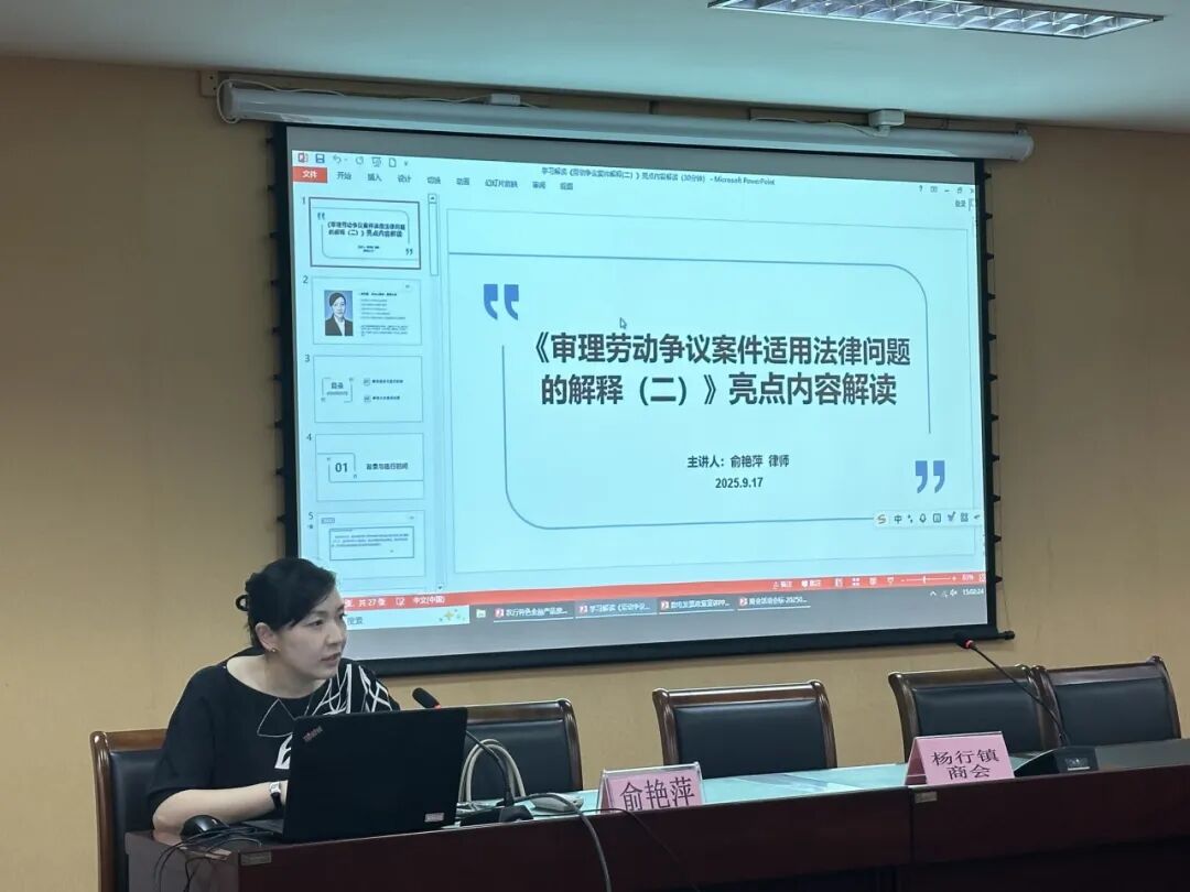 上海市宝山区律师行业党委委员俞艳萍律师为企业家们开展了专题解读,聚焦最高人民法院最新发布的《关于审理劳动争议案件适用法律问题的解释(二)》。俞艳萍律师以新规的六大亮点为核心展开具体分析,助力企业家精准把握新规要点,进一步为企业合规处理劳动争议、规范用工管理提供专业的法律意见。