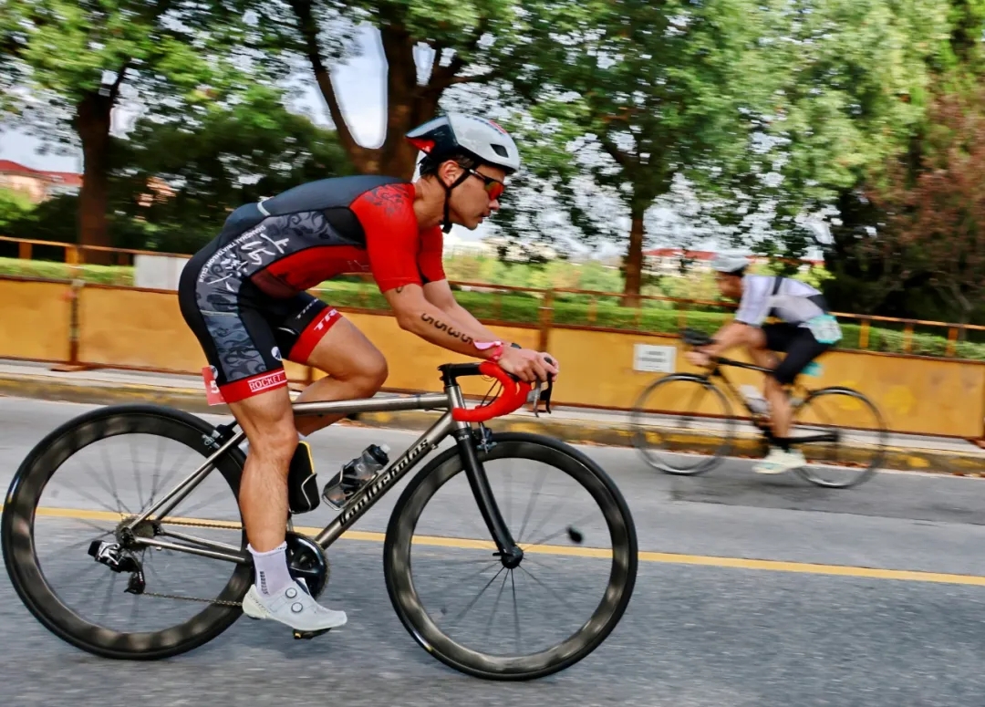 自行车赛段的比拼也十分激烈。选手们沿着沪杭公路飞驰,穿越大堤,沿途的海风、绿树、渔村与大海交相辉映,构成一幅流动的滨海风景画。铁人们紧咬牙关,用汗水与坚持诠释“铁人精神”的硬核内涵。