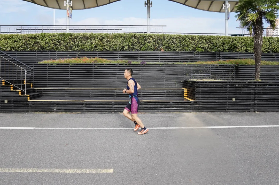 而最后的跑步赛段,就是考验意志的终极战场。选手们奋力向前,急促的呼吸与铿锵的脚步声交织,心跳随着距终点的距离不断加快,他们甩动双臂、调整步频,目光紧锁终点方向,用最后一丝意志冲刺属于自己的荣耀时刻。67岁的参赛选手梁国庆是一位“老铁”,他在今年的比赛中再次挑战自我,刷新了自己的个人记录。“去年我完赛花了2小时08分钟,今年成绩提高了十几分钟,1小时50几分钟的时候,我就冲过了终点,这个成绩我非常满意,感觉再次超越了自我。”