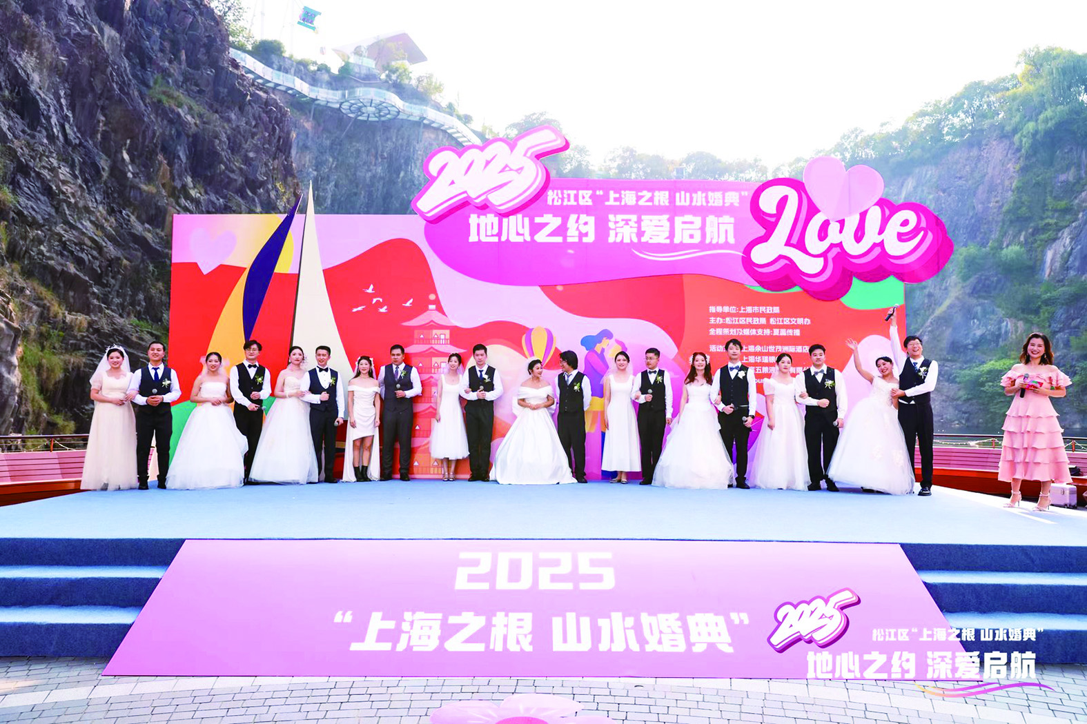 在地下88米深处,11对新人携手走过“花海”步道,在壮美瀑布前许下终生誓言。10月12日,“地心之约,深爱启航”2025年松江区“上海之根,山水婚典”集体婚礼于上海佘山世茂洲际酒店举行,新人们在世界级建筑奇观中开启沉浸式体验。同时,松江区“新家庭启航计划”也正式启动,“婚登+文旅+文创”融合迈入新阶段。