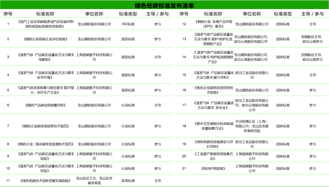 近日,宝山区市场监管局、区发展改革委联合区总工会、宝钢股份、欧冶云商、欧冶工业品、中冶检测、易碳数科在“绿色能源协同供应链脱碳发展会议”上,共同发布21项各级各类标准,深入建设全市绿色低碳转型样板区,打造绿色低碳技术和标准的策源地、实践区、发布地。