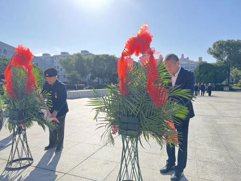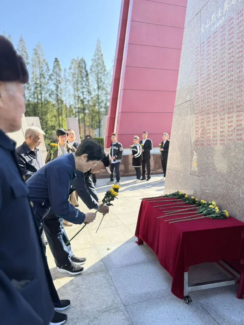 晨光熹微中,“革命烈士永垂不朽”纪念碑巍峨矗立。参与活动的代表身着正装,神情凝重。抗美援朝老兵与工作人员共同向纪念碑敬献花篮,细心整理花篮缎带,随后全体人员躬身默哀,寂静中传递着对英烈的无限追思与崇敬。默哀结束后,众人手持黄菊,缓步走向英名墙,将鲜花轻轻安放于鲜红的姓名之下——这一个个名字,是抗美援朝战场上永不褪色的精神坐标,凝聚着志愿军将士的忠诚与无畏。