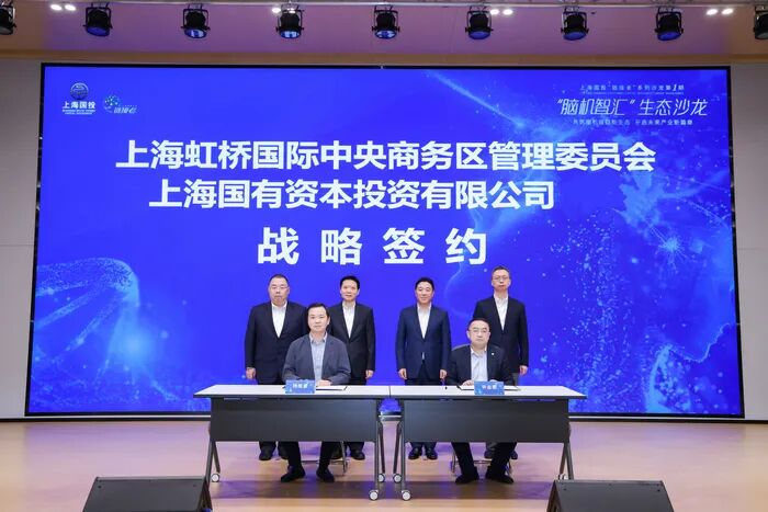 会上,上海虹桥国际中央商务区管理委员会与上海国有资本投资有限公司签署战略合作协议,将聚焦人工智能、生物医药、脑机接口等先导及未来产业,共同推动科技创新与成果转化。
