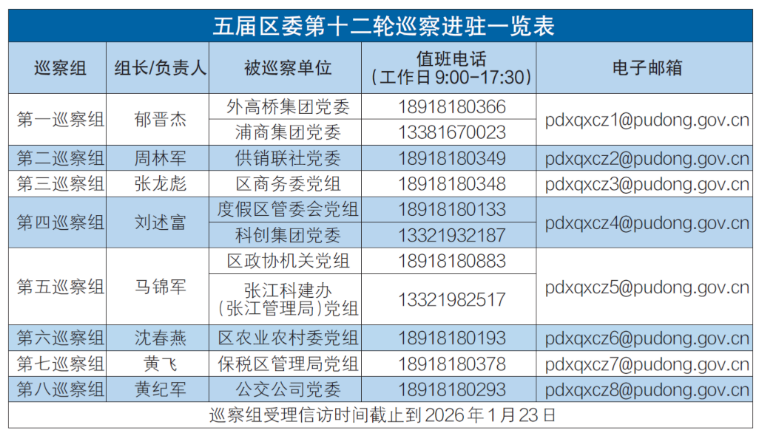 本轮巡察自2025年11月中旬至2026年1月下旬。巡察期间,区委巡察组设专用值班电话和电子邮箱,主要受理反映被巡察单位领导班子及其成员、下一级党组织主要负责人和重点岗位人员问题的来信来电来访,重点是关于违反政治纪律、组织纪律、廉洁纪律、群众纪律、工作纪律和生活纪律以及巡察整改等方面问题反映。其他不属于巡察受理范围的问题,将按规定移交被巡察单位或有关部门处理。巡察组受理信访时间截止到2026年1月23日。