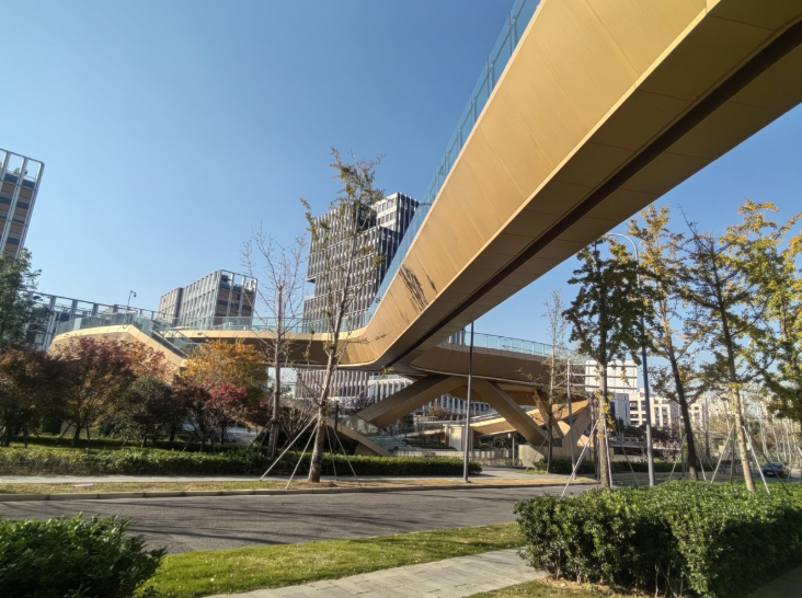 金鼎区域在慢行精品区创建中,利用多层行道树、多道绿化带的景观布局,自然区分车行道、非机动车道、人行道的通行空间,保障慢行通行路权。路口“零高差”的坡道设置也方便了非机动车、轮椅通行。空中则设有二层连廊和步行天桥,跨越河道和道路,并延伸至建筑内。其中一座连廊跨越了西群河,东侧连接申启路上的商办楼,西侧连通申涛路上的楼宇。