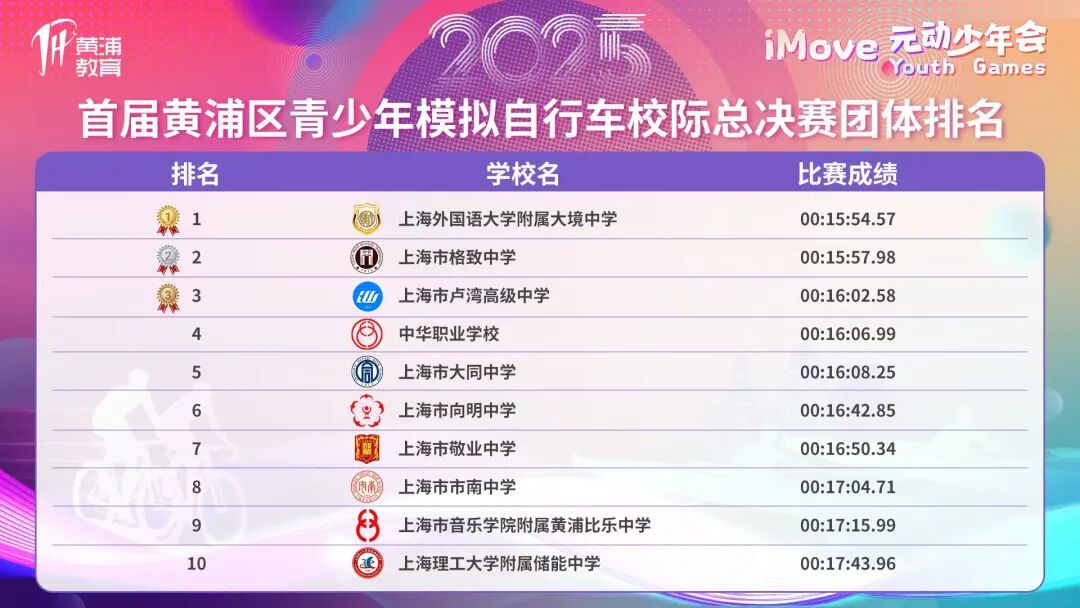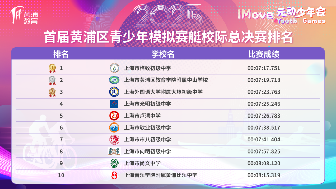 经过激烈角逐,上海市格致初级中学与上海外国语大学附属大境中学分获虚拟赛艇与自行车项目校际总决赛团体冠军。成绩在直播中实时公布,各校师生在各自场地共同见证了冠军的诞生。