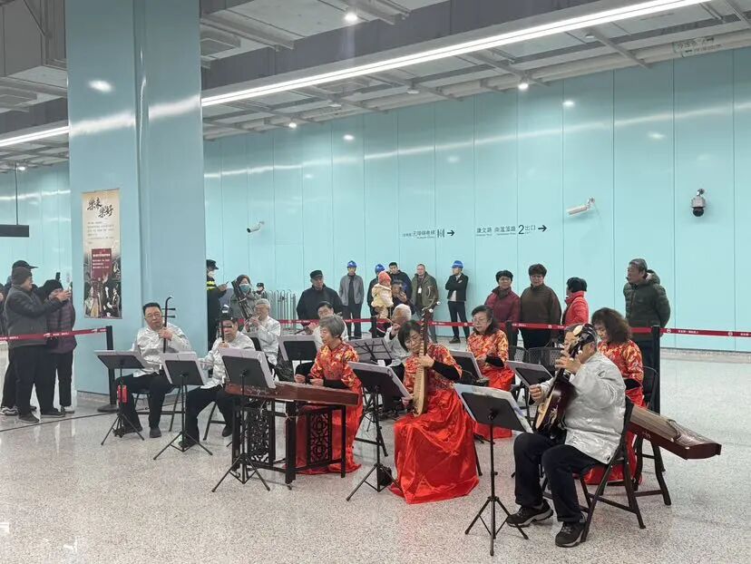 今天上午九点半,记者来到上海地铁18号线康文路站点。站厅内,百年丝竹清音萦绕地铁空间,庙行江南丝竹的乐手们,以笛、二胡、琵琶、扬琴为核心,搭配笙、箫、阮、古筝等,奏响了《中花六板》《三六》《行街》等八大名曲,随后,莫派魔术传承人则带来近景魔术互动表演,精彩的手法变幻引得现场阵阵欢呼,让乘客在出行途中感受“海派”非遗的独特魅力。现场不少市民举着手机记录通车时刻,大家你一言我一语,分享着对新线路的期待。“很开心的,我们天天来看,昨天来了三次,交通方便多了。我们准备乘到底看看,再回来。”市民赵阿姨难掩兴奋。