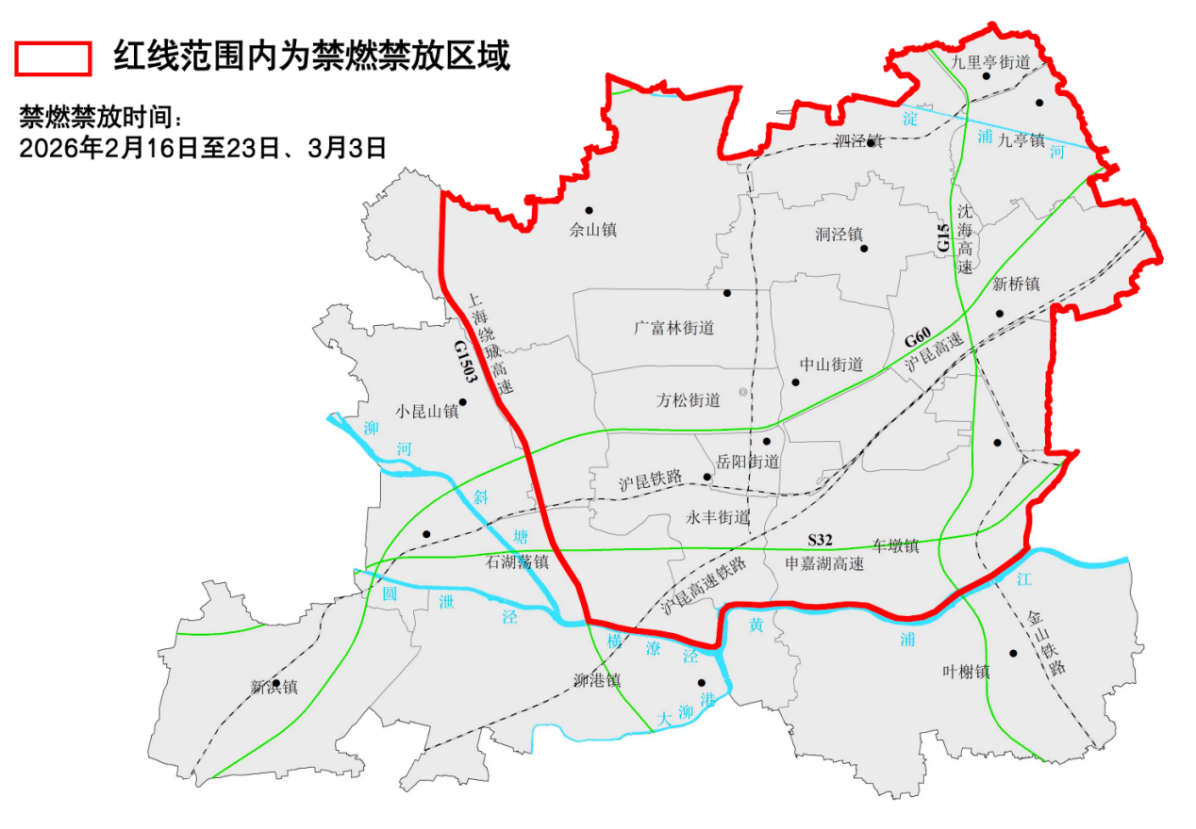 二、禁止2026年2月16日(除夕)至23日(初七),以及2026年3月3日(元宵节),在东至松江-闵行区界、南至黄浦江、西至G1503(上海绕城高速)、北至松江-青浦区界的合围区域燃放烟花爆竹。