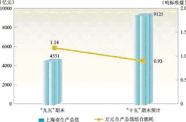 “十五”期间,全市生产总值年均增长率达到11.5%,实现连续14年保持两位数增长,2005年全市生产总值预计达到9125亿元,按常住人口计算的人均生产总值达到5万元,二、三产业共同推动经济增长的格局进一步巩固,现代服务业和先进制造业加快发展,工业结构和产业基地能级明显提升,农业现代化建设取得初步成效。综合经济效明显改善,2005年地方财政收入预计达到1434亿元,万元生产总值综合能耗从“九五”期末的1.14吨标准煤降至0.93吨标准煤,降幅达18.4%(见图1-1)。
