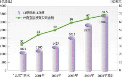 APEC会议、全球扶贫大会、世界工程师大会等重大国际性会议在上海成功举办。对外开放领域不断拓展。推进“大通关”工程,洋山保税港区投入运营,口岸服务功能进一步增强,2005年上海口岸进出口总额预计达到3506亿美元,外商直接投资实到金额累计超过280亿美元(见图1-6)。与长江三角洲及全国其它地区的经济合作领域不断扩大,对口支援工作取得新进展。与香港、澳门和台湾地区的经贸交流与合作进一步深化。