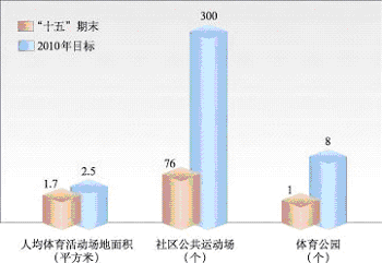 (四)提高群众体育和竞技体育水平大力开展全民健身运动,加强公共体育基础设施网络建设和管理,整合社会资源,促进学校等体育场地向社区开放,基本实现每个社区和村镇都有公共体育活动场地(见图14-2),使经常性参加体育锻炼的人数达到全市总人口的50%。继续建设亚洲体育中心城市,实施奥运争光计划,力争2008年奥运会取得更好成绩;加强体育与教育结合;每年举办一批具有较高国际知名度的体育赛事活动。