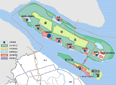 有序推进综合开发和生态保护。按照崇明三岛功能定位和建成崇明生态岛群的总体目标,分步实施发展规划(见图8-4)。“十一五”期间重点进行基础性开发,以长江隧桥工程和长兴岛造船基地建设为契机,统筹三岛产业发展,加快建设城桥、陈家镇(东滩)试点城镇和一批重要项目。按照环境优先、生态优先的要求,根据永久保护区、开发控制区、战略储备区和适度建设区的功能区划分,保护好湿地、河湖等自然生态,合理利用岛域土地资源,重点发展循环农业和环境友好型产业。
