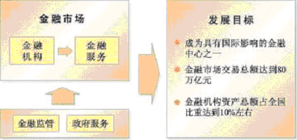 重点发展金融业。围绕国际金融中心建设,加快完善金融机构、金融市场、金融服务和金融监管体系。按照稳步推进的原则,积极探索金融业综合经营的有效方式,优化整合地方金融机构,引进和组建新兴金融机构,进一步集聚各类金融机构和金融人才。积极促进金融衍生品、保险和再保险、离岸金融、债券等市场和业务发展,推动金融产品创新中心建设;支持和完善资本、货币、外汇、期货、黄金和产权市场建设。加强托管、交易、清算结算等金融市场基础设施建设,促进金融市场之间的连通互动。完成股权分置改革,提高上市公司质量。加强信用征信体系建设,强化金融风险防范和处置,继续建设金融安全区。积极发展金融辅助产业,加强金融生态环境建设。(见图5-1)。