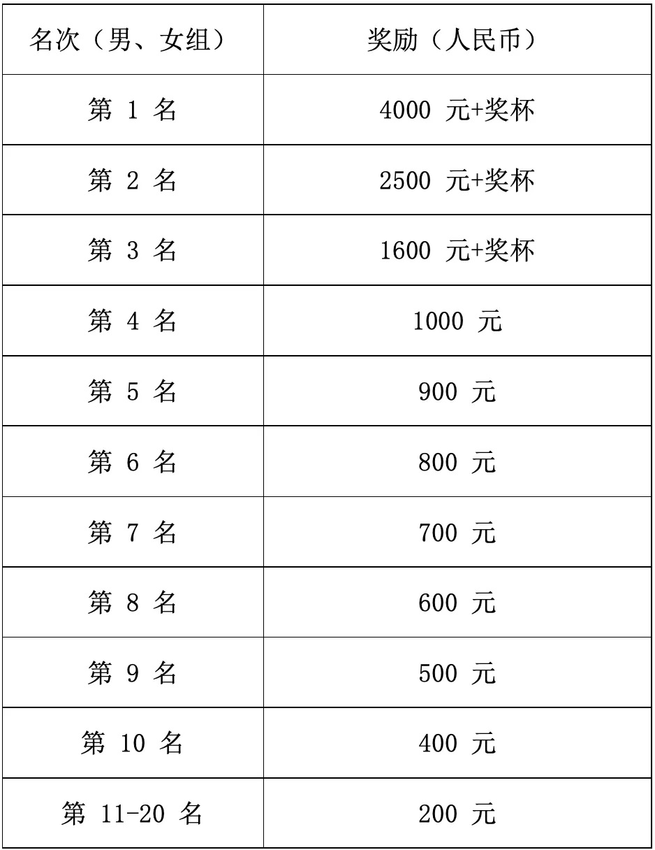 ①按枪声成绩分别录取男、女前三名上台领奖,按净成绩分别录取男、女4-20名给予奖励,具体奖励标准见下表: