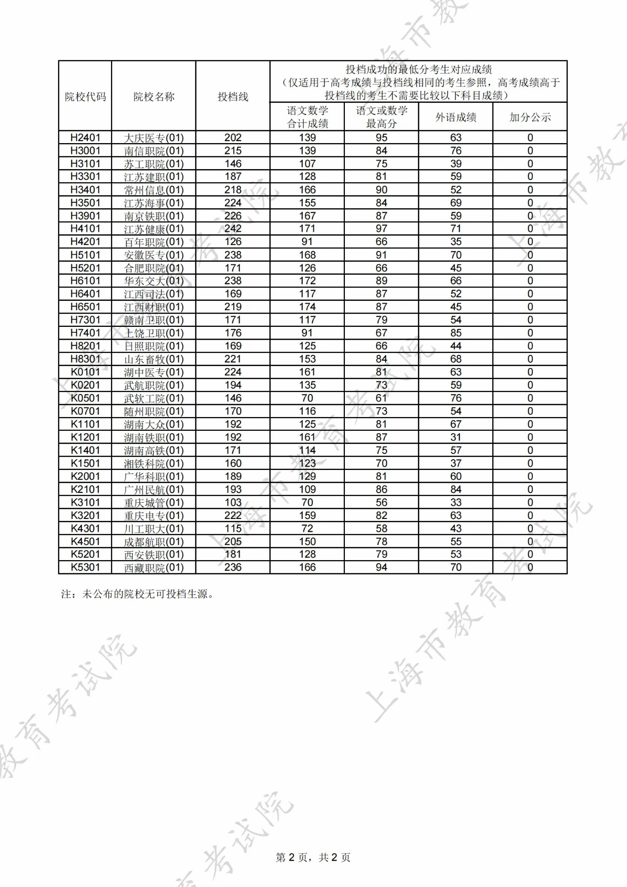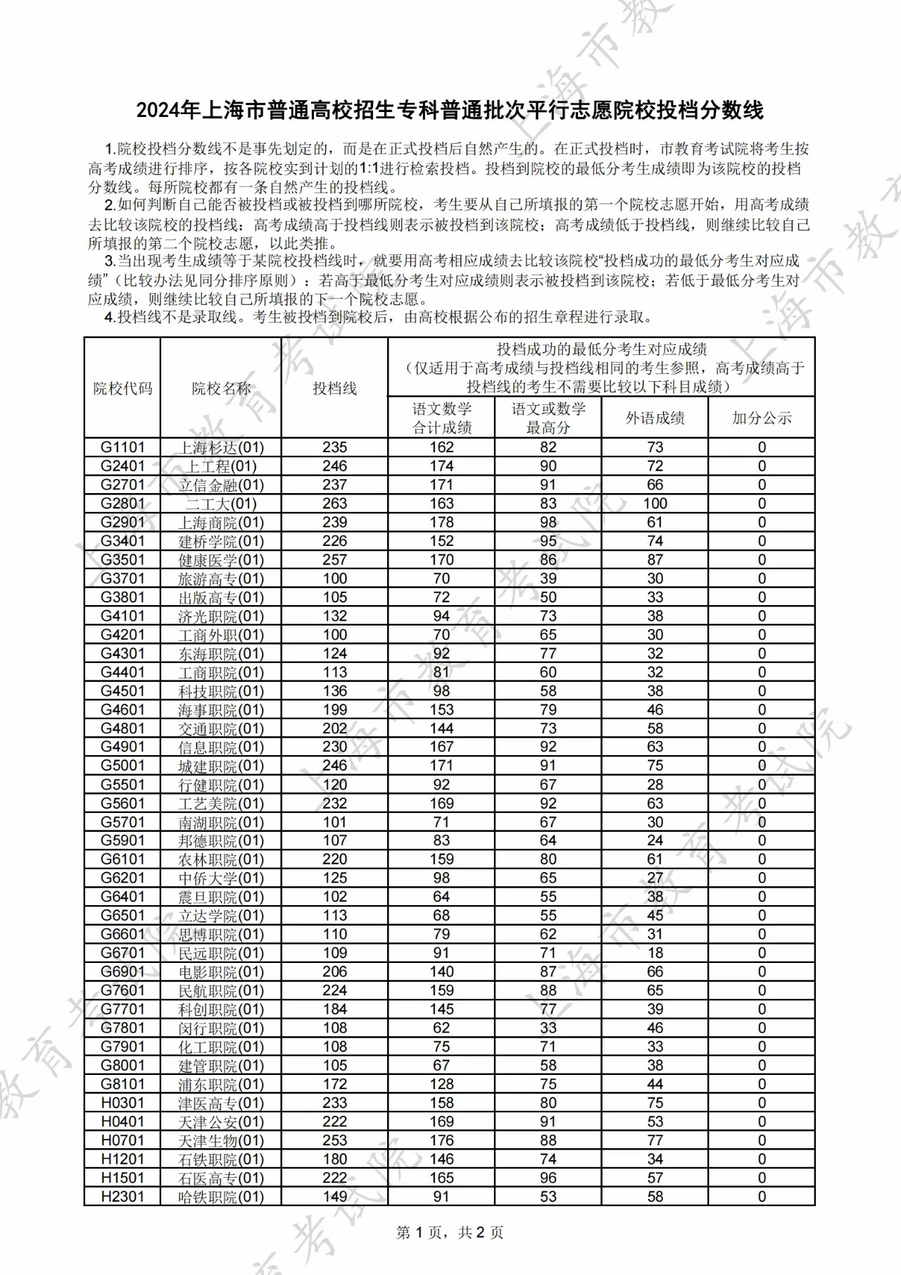 2024年上海市普通高校招生专科普通批次平行志愿院校投档分数线公布