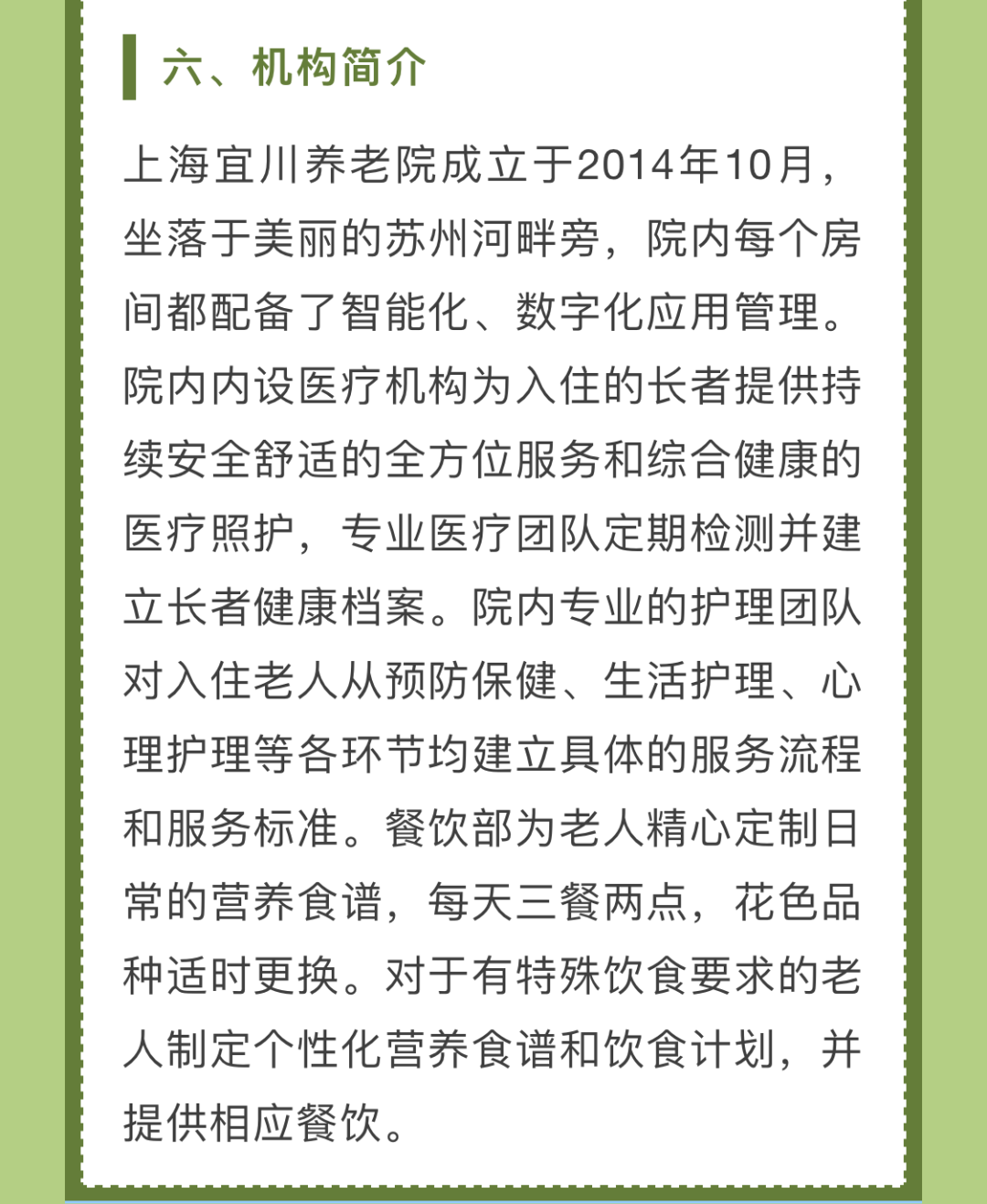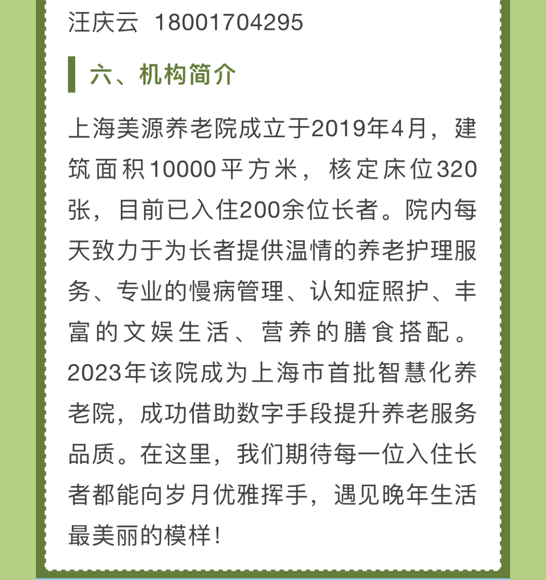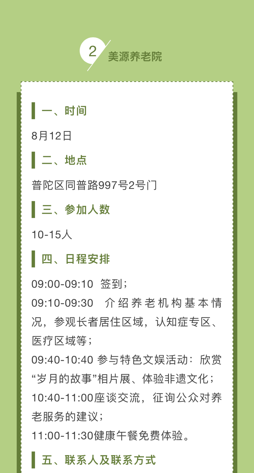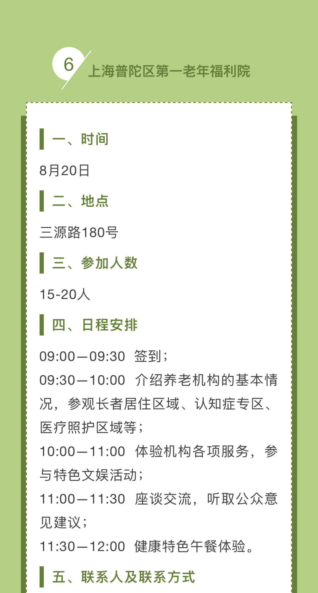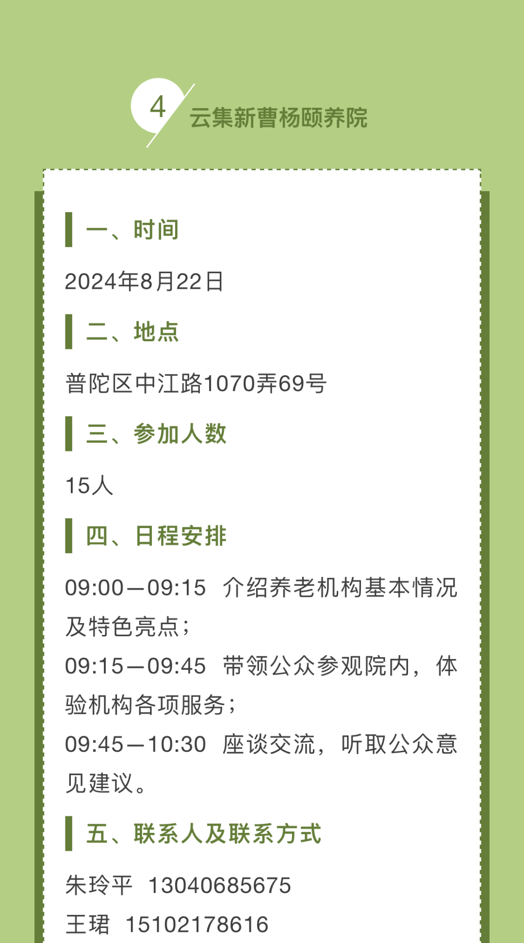 为了让广大市民和社会公众近距离了解本市养老机构,感受机构内开展的生活照料、康复护理、健康管理、专业照护、精神慰藉、智慧养老等服务,今年的政府开放月期间,我们在全市范围内选取了一批优质、特色养老机构,围绕“民心工程、为民办实事”这一主题,组织开展养老机构服务体验活动。这些养老机构将结合各自特色,提供参观介绍、特色体验、床位试住、文娱活动、意见征集、座谈沙龙或其他项目。