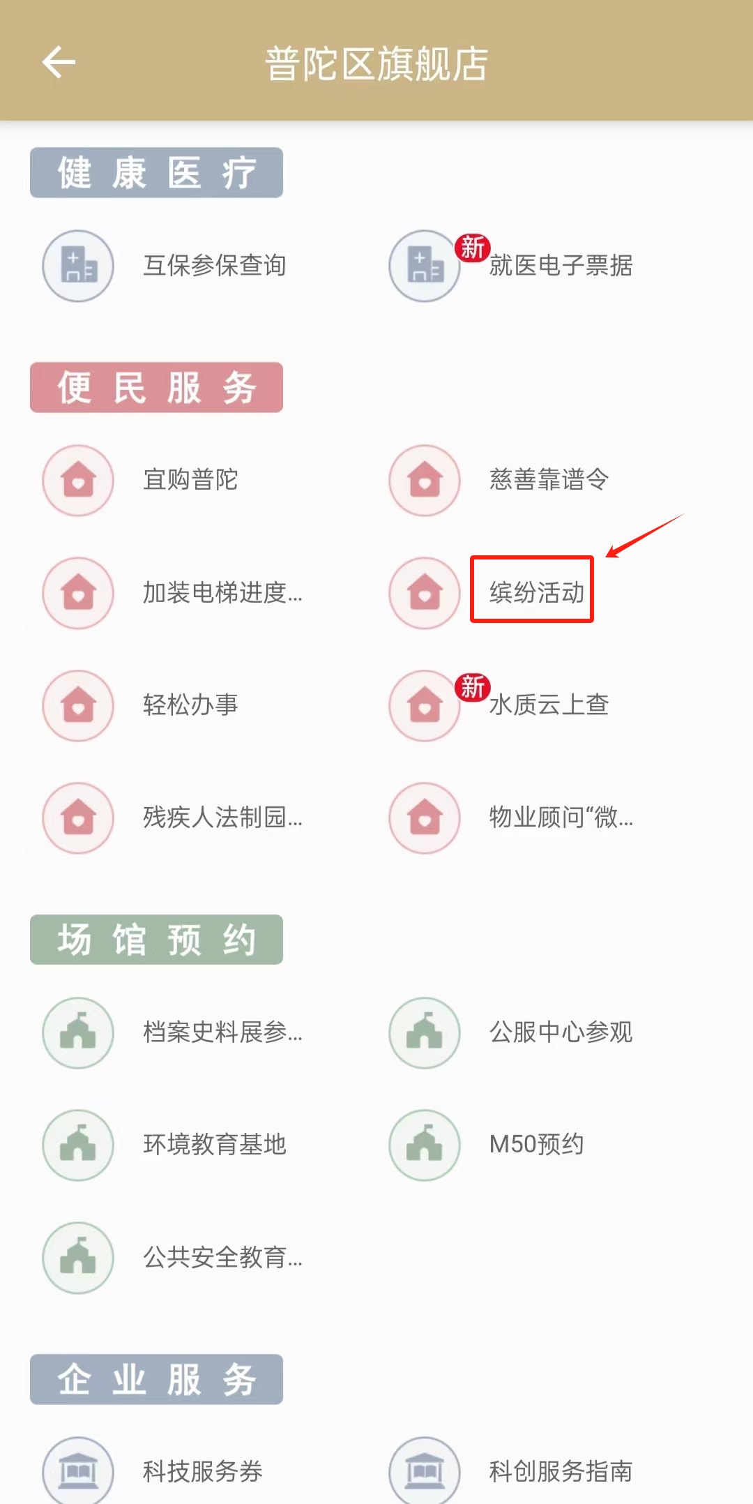 第二步:点击“靠‘普’服”,在“便民服务”栏目中点击进入“缤纷活动”