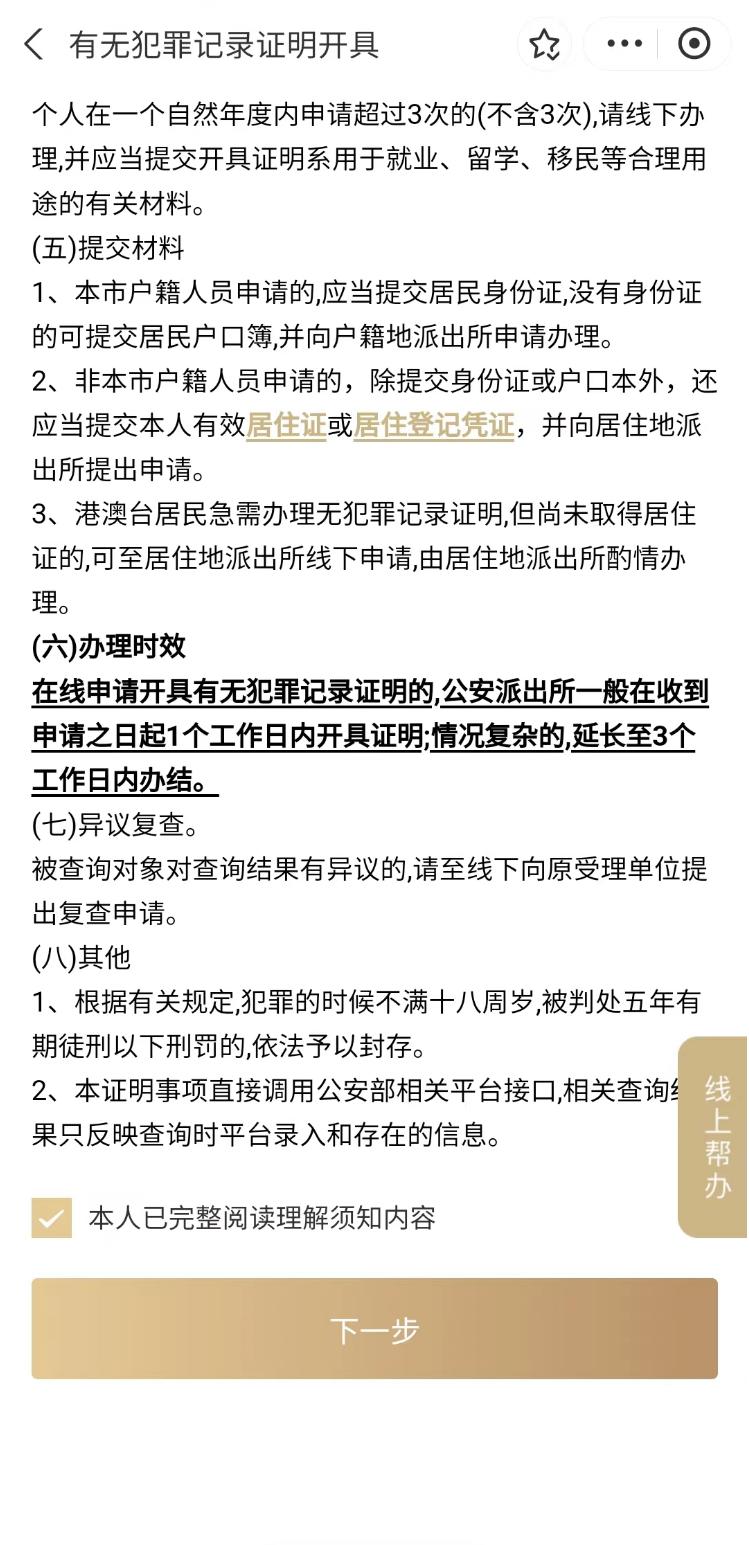 有无犯罪记录证明开具全面实施“跨省通办”,大家可根据自身实际情况选择对应办理入口,阅读办理须知后点击“下一步”进行办理。