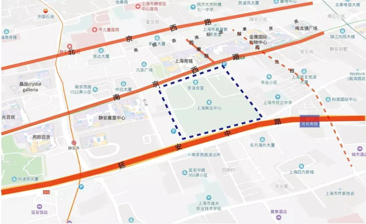 上海展览中心观众入口分别位于延安中路的0号门和位于南京西路的8号门。