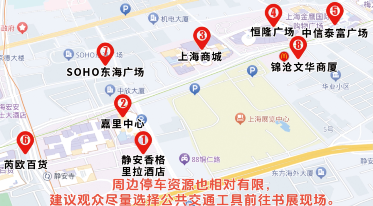 市公安局、市公安局交警总队介绍,2024年上海书展主会场将于明天起至8月20日在上海展览中心(延安中路1000号)举办(每天开放时间为9:00-21:00,周五、周六延伸至21:30)。展会期间,上海展览中心内部不设社会停车场,请广大市民群众尽量选择公共交通前来观展;自驾机动车的市民可至场馆周边商业停车场有序停放车辆,杜绝违法停车、违反禁止标志、违法鸣号等交通违法行为。来看交通攻略。