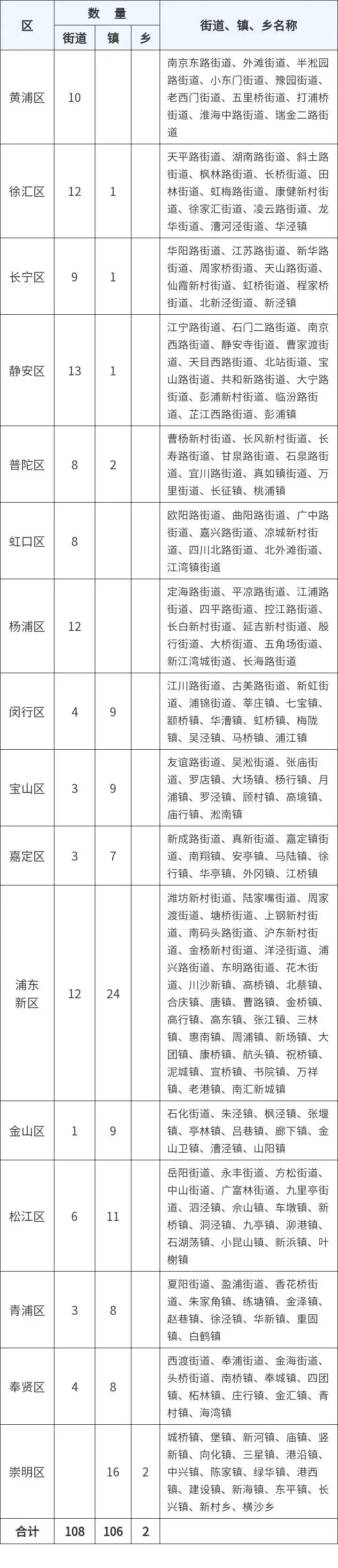 你知道上海现在有多少街道多少乡镇吗?市民政局公布最新上海行政区划名称表:截至2024年7月31日,全市16个区共有108个街道、106个镇、2个乡。所有街道、镇、乡名称详见↓