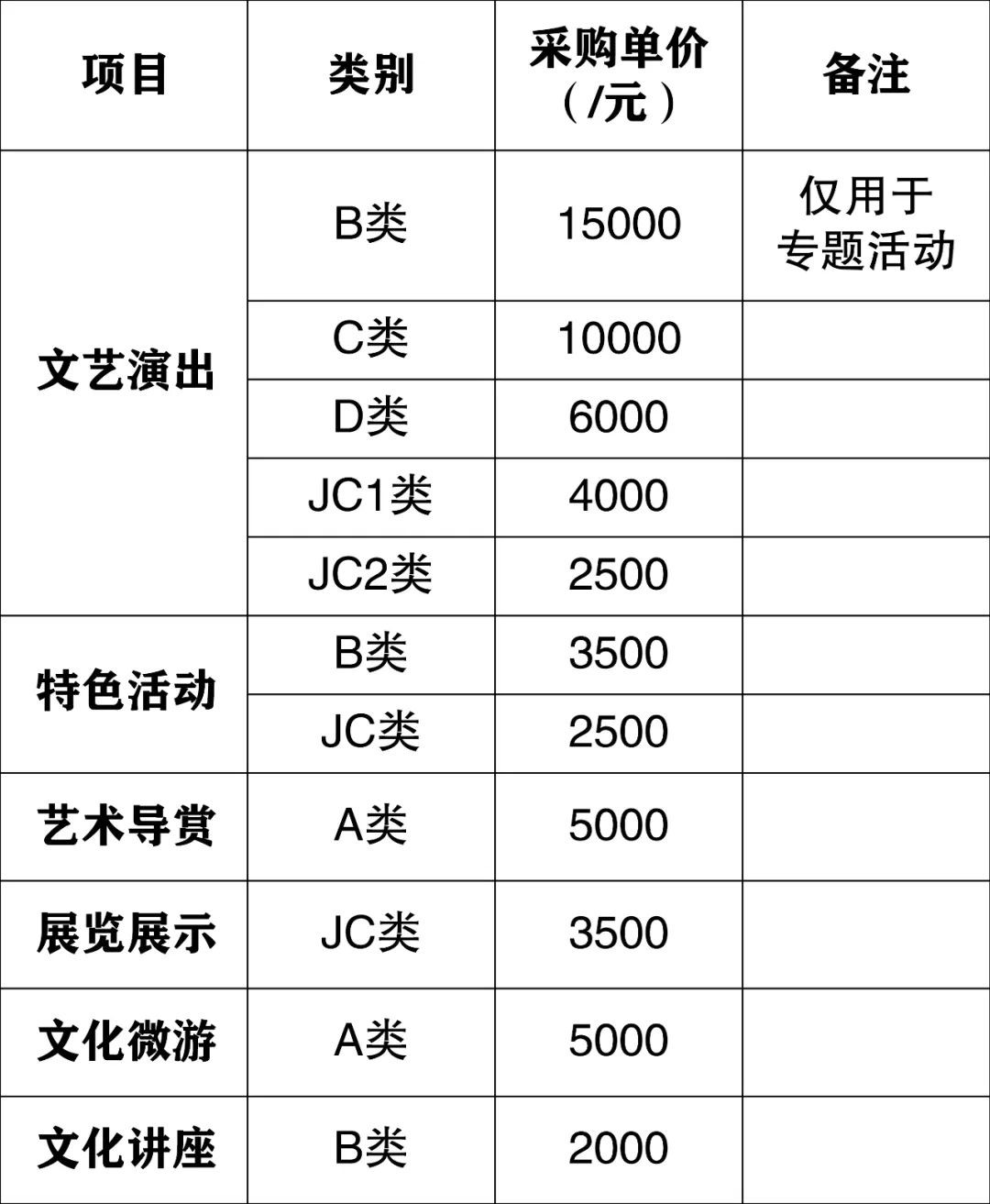 2.涉及富有特色的都市文化、乡土文化、“非遗”文化、亲子文化、创新艺术等。以本土古文化、水文化、“非遗”文化作为重点采购对象。内容突出互动性,即活动能够让受众亲身参与、现场体验。