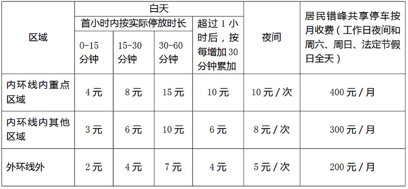 注:1.有关白天和夜间的具体时段以道路停车收费标志牌公示的时段信息为准;2.超过1小时后,按每增加30分钟作为一个累进计费单位,每增加不足30分钟的,按照30分钟计费。