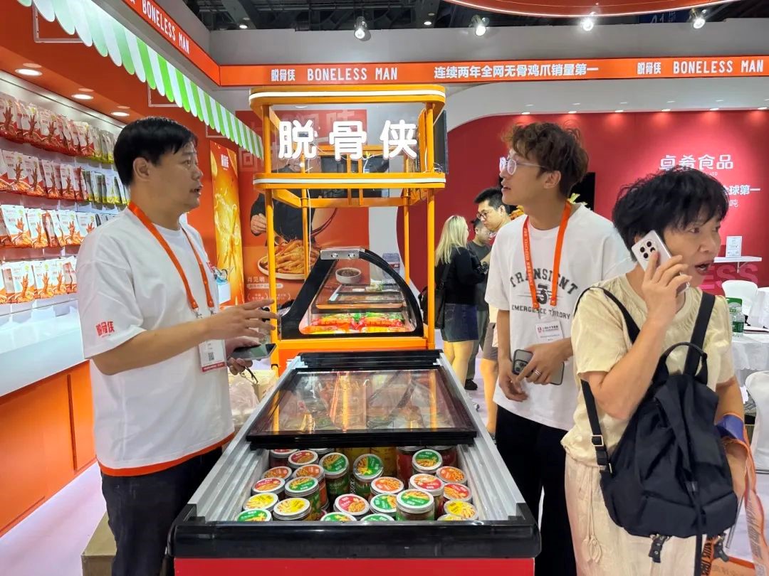 在休闲食品展区,商品更是琳琅满目,创意无限。各大知名IP的联名商品,栩栩如生的卡通巧克力,含在口中即可听到音乐的棒棒糖……卓希食品的“脱骨侠”系列,成为卤味爱好者关注的焦点之一。“我们精心准备了无骨鸡爪、虎皮凤爪等冷冻及真空小包装食品,每一口都是鲜香爽口的极致体验。”卓希食品董事长马寿良介绍道。