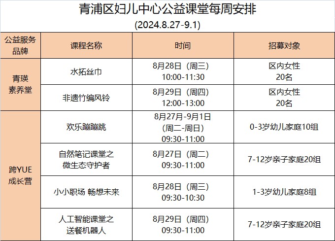 青浦区妇儿中心活动预告(2024.8.27-2024.9.1) 2024-08-26 来源:青浦区人民政府