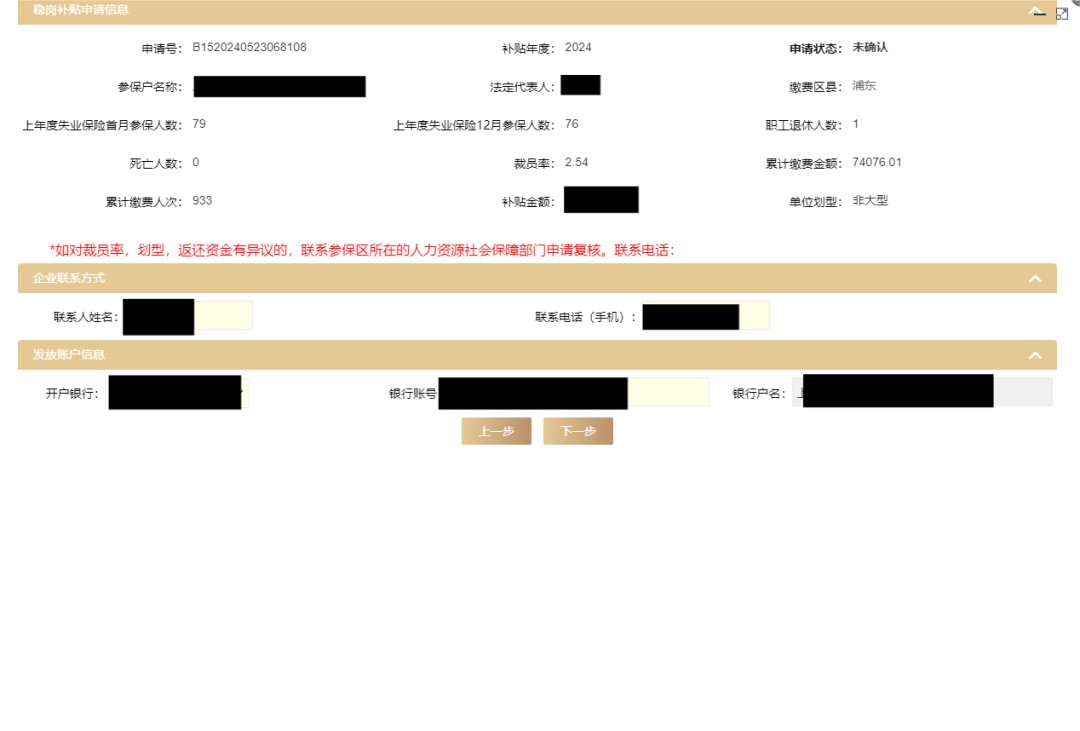 3、用人单位选择“愿意接收补贴并承担相应义务”后,进入信息确认界面,需重点对裁员率、划型、补贴金额、银行账户等信息进行确认。